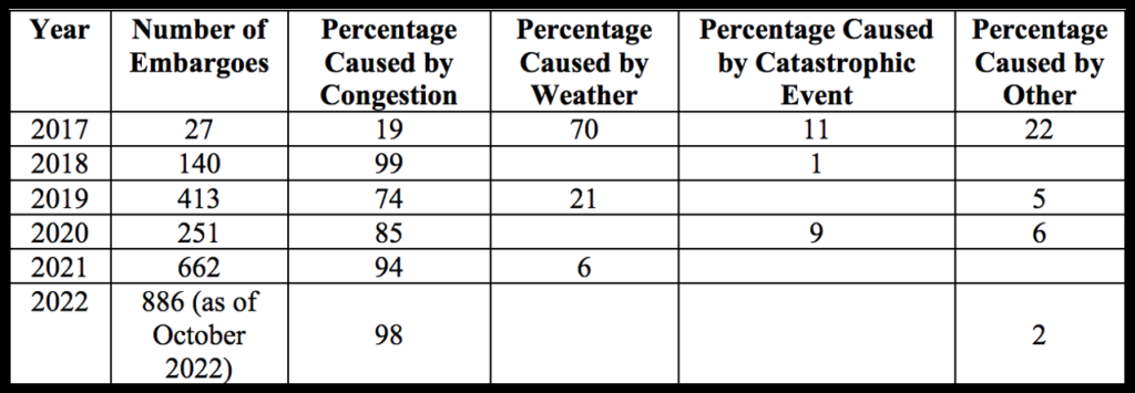 At the December hearing, STB said it expects “testimony on topics including, but not limited to, the railroad’s decision-making process in determining whether to issue an embargo, data inputs, its consideration of shippers’ operational needs, and explanations for the dramatic increase in embargoes since 2017.” STB has also invited testimony from shippers and other stakeholders, “who can contribute to the Board’s understanding of the cause and/or impact of the embargoes.”