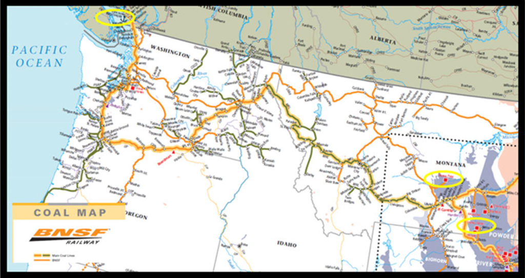 The Powder River Basin (PRB)-to-Westshore coal movements originate in the PRB and move north and west through Montana and then north through Everett, Wash., into Canada to Westshore’s coal terminal in British Columbia. The route is illustrated by the highlighted portions of the map above. (Map and caption details courtesy of BNSF)