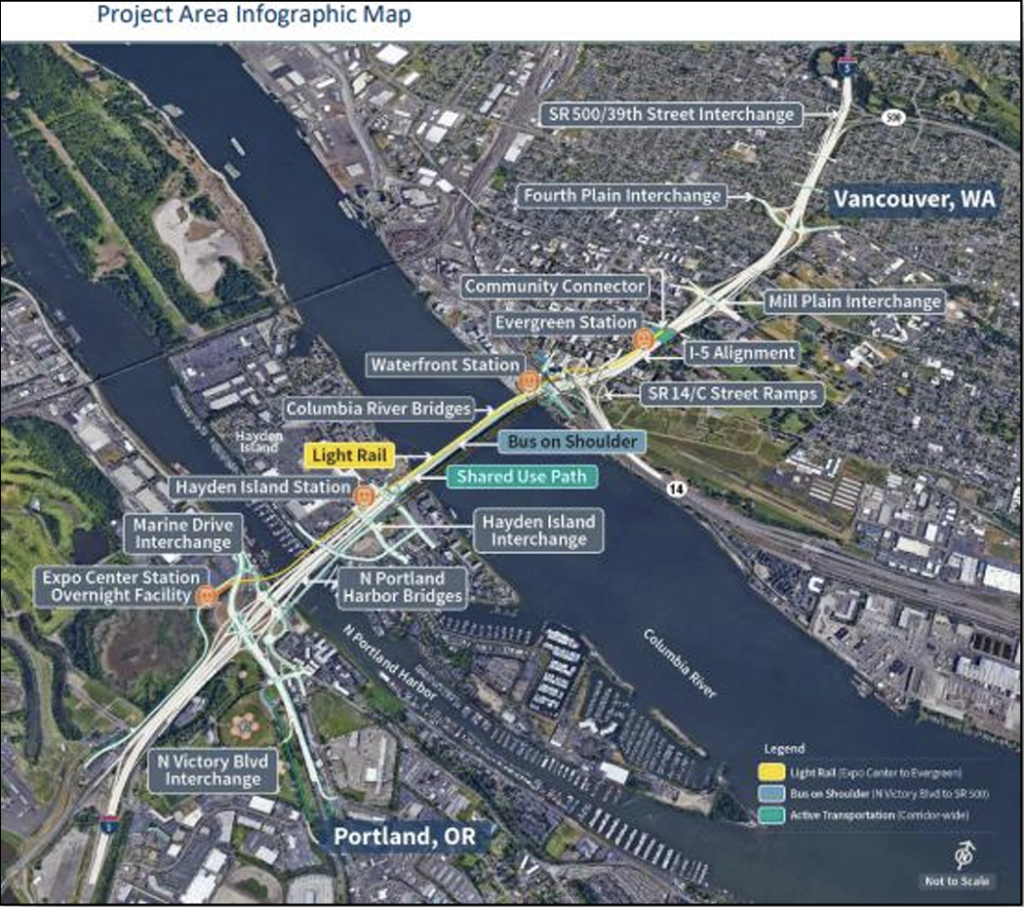 - Interstate Bridge Replacement Program (Portland, Ore., and Vancouver, Wash.): The Washington State Department of Transportation (DOT) in partnership with the Oregon DOT will receive $600 million to update Interstate 5 with a “seismically resilient” replacement of the I-5 bridge over the Columbia River, connecting Portland and Vancouver. The new bridge will include transit improvements “such as additional light-rail transit service, enhanced zero-emission express bus service, and the expansion of active transportation networks,” USDOT said. This award also includes FY 2025 Mega funding.