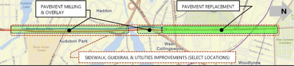 - Route 168 Reconstruction Project (Camden County, N.J.): The New Jersey Department of Transportation (DOT) will receive $8 million to improve Route 168 with reconstructed pavement (from approximately M.P. 9.80 to 10.75), resurfaced pavement (from approximately M.P. 8.56 to 9.80), “Road Diet” and “Complete Streets” enhancements (from approximately M.P. 9.80 to 10.75), ADA accessible sidewalks, approximately eight signalized intersections, bicycle lanes (from approximately M.P. 9.80 to 10.44), improved bus stops, at-grade rail crossing safety improvements, guiderail upgrades, utility relocations, upgraded stormwater management infrastructure, and Intelligent Transportation System deployment.