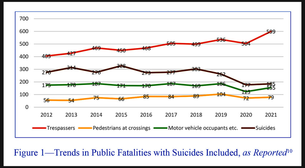 As recently pointed out in an Eno Foundation report, trespassers on rail rights-of-way and users of highway-rail crossings (including, for this purpose, established pedestrian crossings) account for the vast majority of fatalities and serious injuries associated with railroad operations. The trespass problem is the larger segment. We didn’t need an Eno report to tell us this, of course, since it is common knowledge in the railroad community and in government.