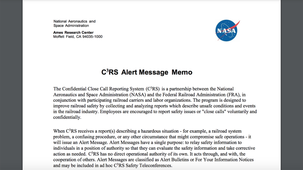 C3RS was established to “improve railroad safety by collecting and analyzing reports that describe unsafe conditions and events in the railroad industry. Employees are able to report safety issues or ‘close calls’ voluntarily and confidentially.” C3RS has no direct operational authority.