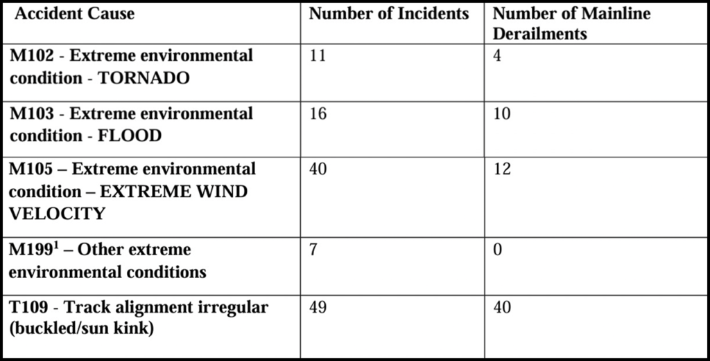 According to the FRA, 123 rail accidents/incidents have been reported to the agency as “having been caused, in whole or in part, by severe weather conditions or weather-related events (e.g., hurricanes, tornadoes, wildfires, flooding, mudslides, and summer heat)” since the beginning of 2021, and more than half were main-track derailments (see chart below). Such extreme weather conditions and events “not only present hazards to railroad workers, operations and infrastructure, but also can severely impact the customers and communities relying on the railroads for travel and transportation of critical goods,” FRA said.