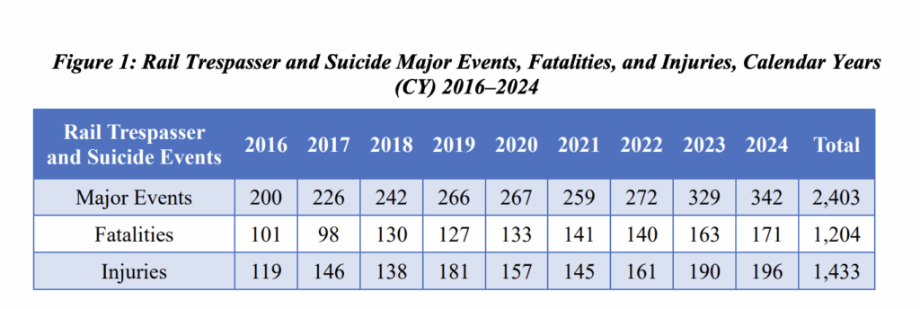 Rail trespass and suicide major events, fatalities, and injuries steadily increased from 2016 to 2024, according to the FTA. Rail trespass and suicide major events increased 71%, fatalities increased 70%, and injuries increased 65% when comparing 2016 to 2024.