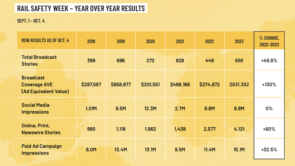 “Once again, our Board of Directors, Operation Lifesaver State Programs, federal government and safety partners across the U.S. shared our Rail Safety Week campaigns and messaging, generating 8.8 million social media impressions and over 4,100 news stories,” said OLI Executive Director Rachel Maleh, who noted that partner numbers are growing. “OLI’s Rail Safety Week digital national and state campaigns on social media channels and via streaming devices, made possible through grant funding from the Federal Railroad Administration, Federal Highway Administration and Federal Transit Administration, resulted in 15.1 million impressions throughout the U.S.” See results chart below: